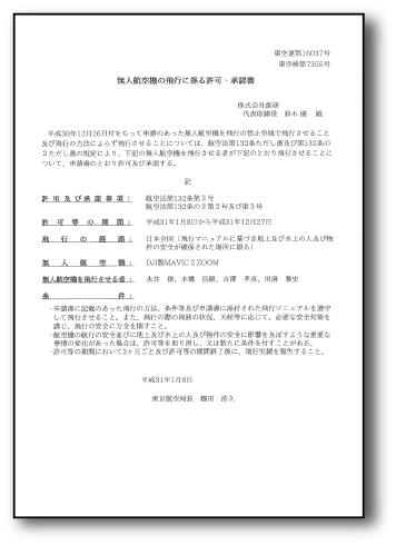 ドローンを使用するには、国土交通省の発行する無人航空機の飛行許可が必要です。当社では国土交通省が認定するライセンスを取得しています。