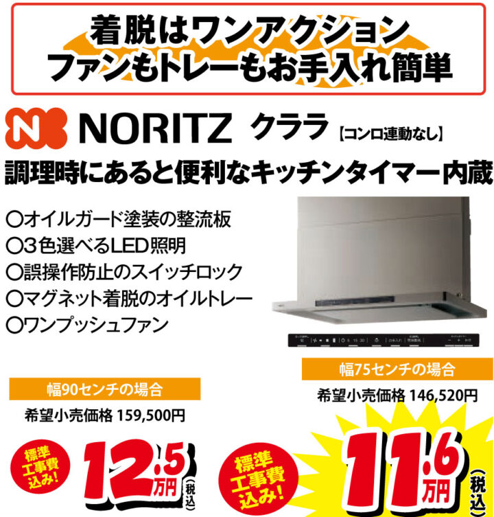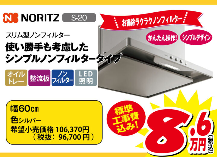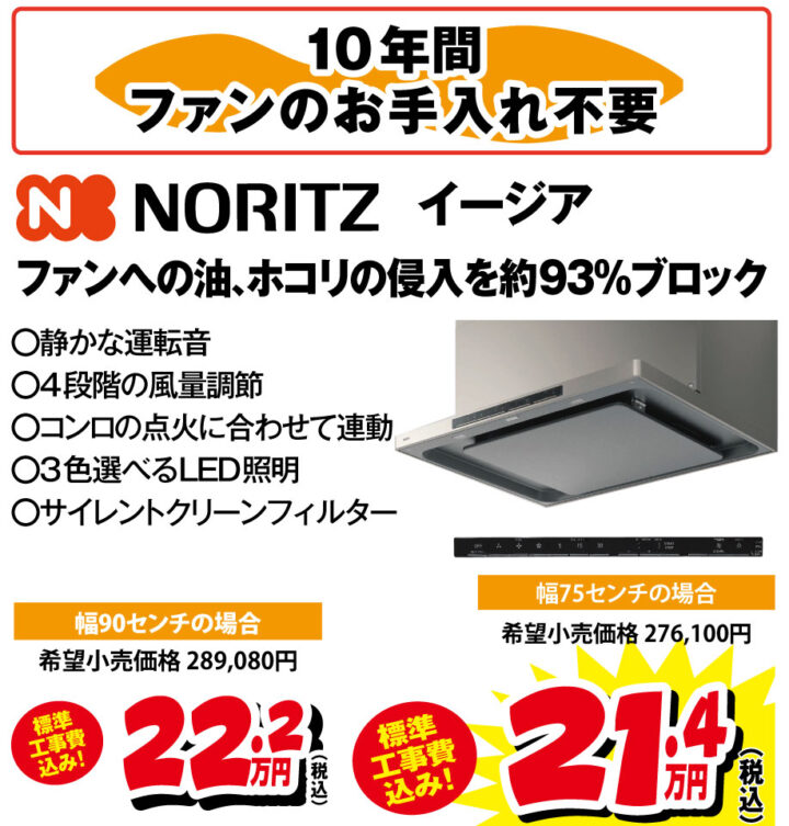 ノーリツのノンフィルター(フィルターなし)タイプのレンジフードです。年末の大掃除シーズンが楽になる、日々の手入れが簡単なモデルです。工事費込みでこの価格で工事できるのは今だけ!