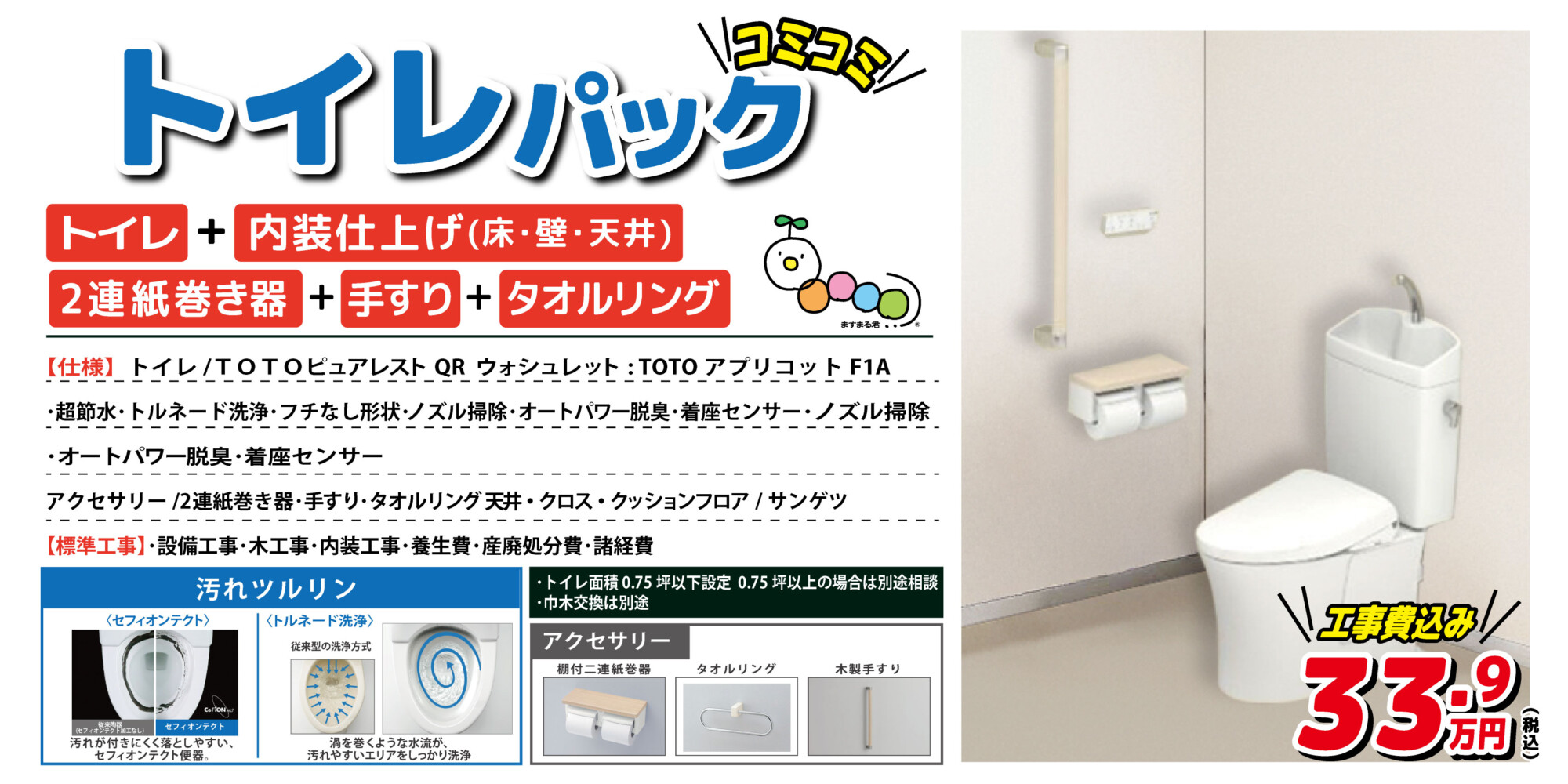 トイレおまかせパックは、TOTO「ピュアレストQR」+サンゲツ柄クロス・床材、アクセサリ3種を工事費込みでご提供します。どんな空間にも馴染むセットです。