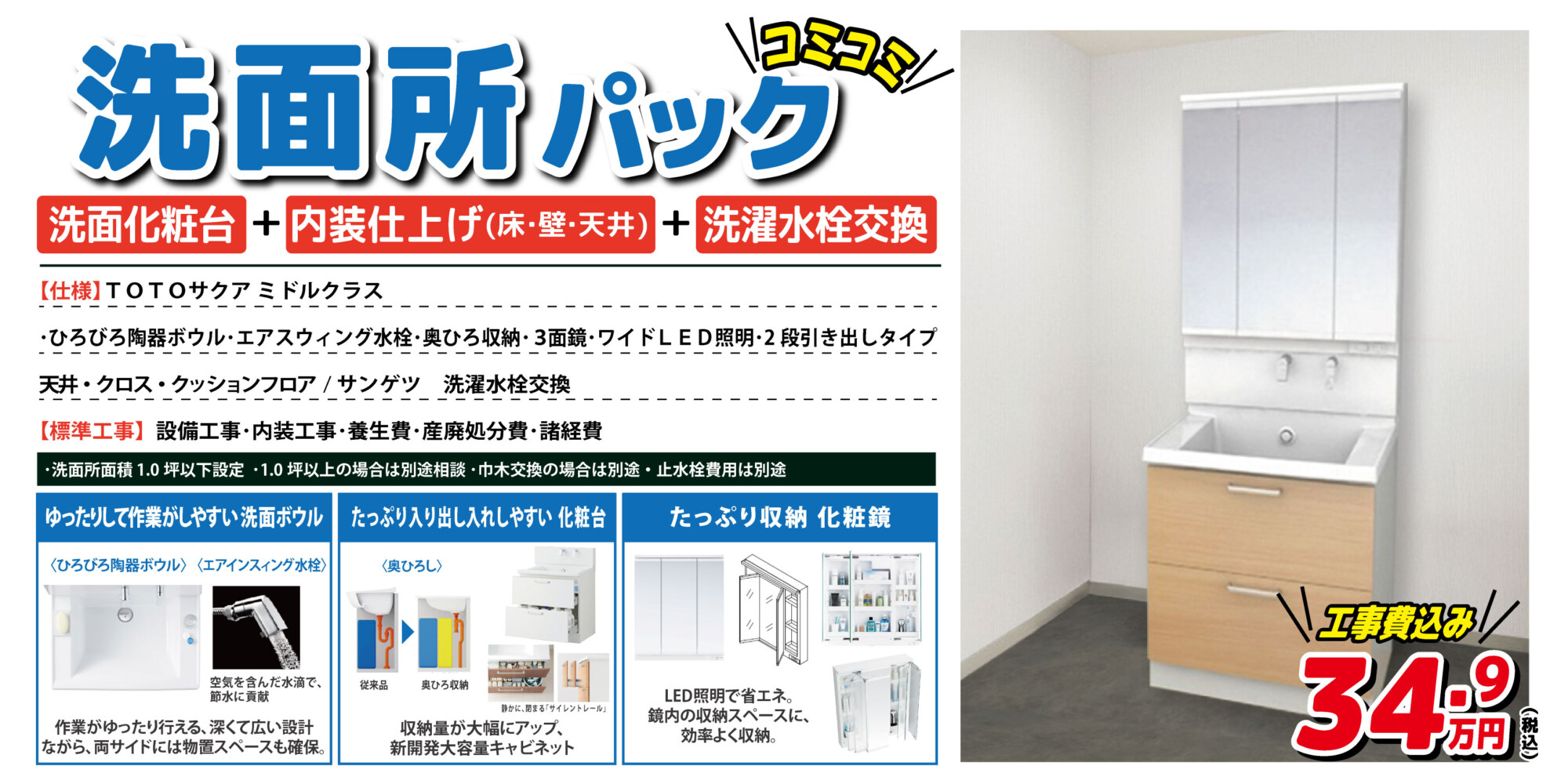 洗面所おまかせパックは、TOTO サクア×サンゲツ柄クロス・床で統一感を演出。さらに緊急止水弁付きの洗濯水栓をセットで工事費込みの安心価格でお届けします。