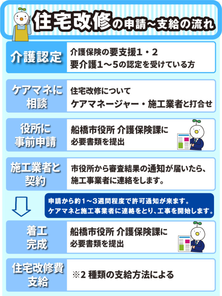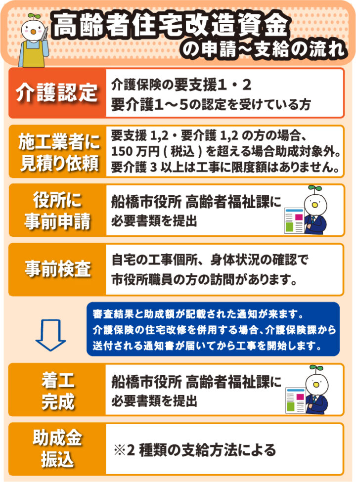 ここでは、住宅改修費の支給制度と船橋市の高齢者住宅改造資金の助成の対象となる工事の種類を、