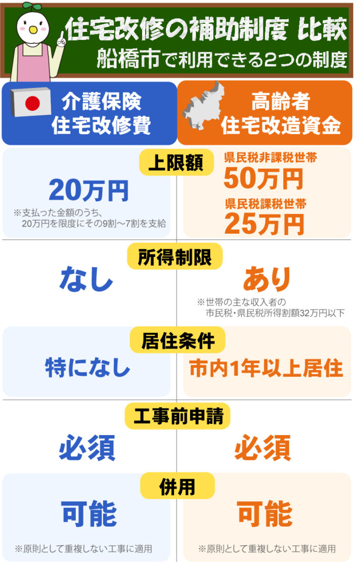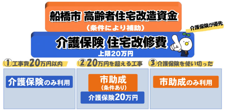 住宅改修費の支給制度を優先的に適用し、その不足分や対象外となる工事を船橋市独自の高齢者住宅改造資金の助成で補うのが基本ルールです。