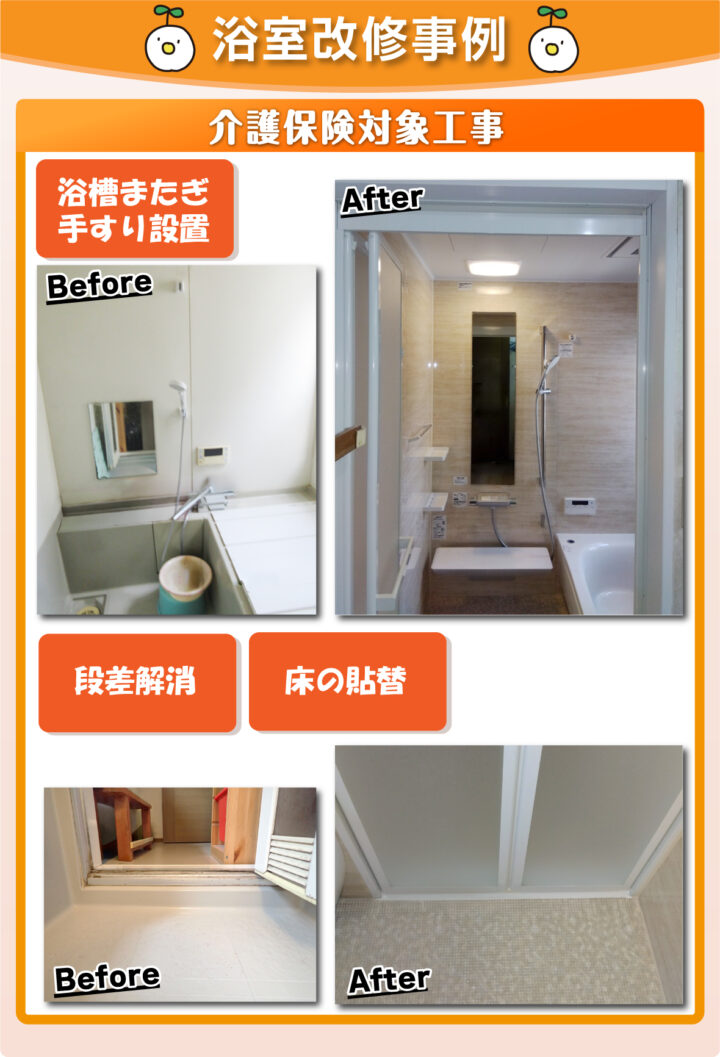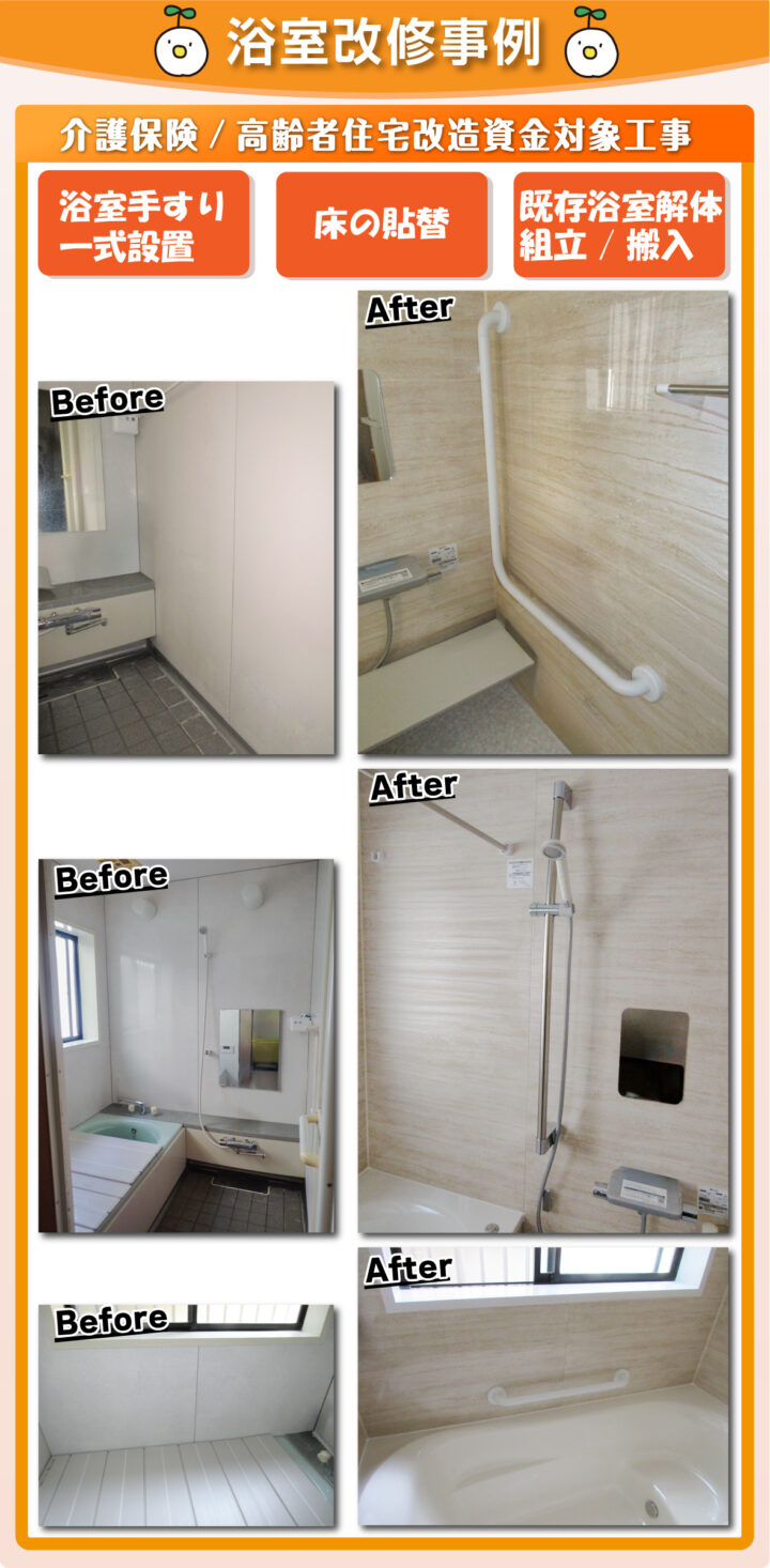 浴室に手すりがなく、洗い場の床が滑りやすいため転倒の危険がありました。