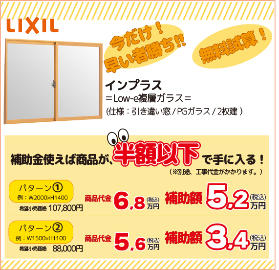 ※掲載価格と価格は一例です。お客様の家の窓サイズや仕様によっては、補助額が商品代の1/2相当に満たない場合もございます。