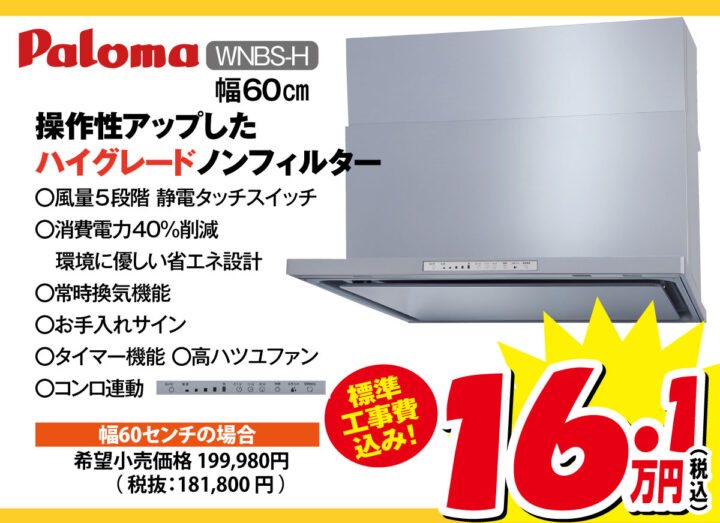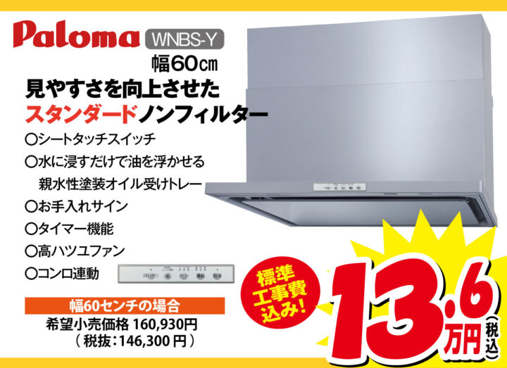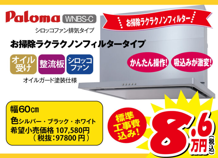 パロマの「WNBS-C」は、掃除のしやすさを追求したノンフィルター(フィルターなし)タイプのレンジフードです。年末の大掃除シーズンが楽になる、日々の手入れが簡単なモデルです。工事費込みでこの価格で工事できるのは今だけ!