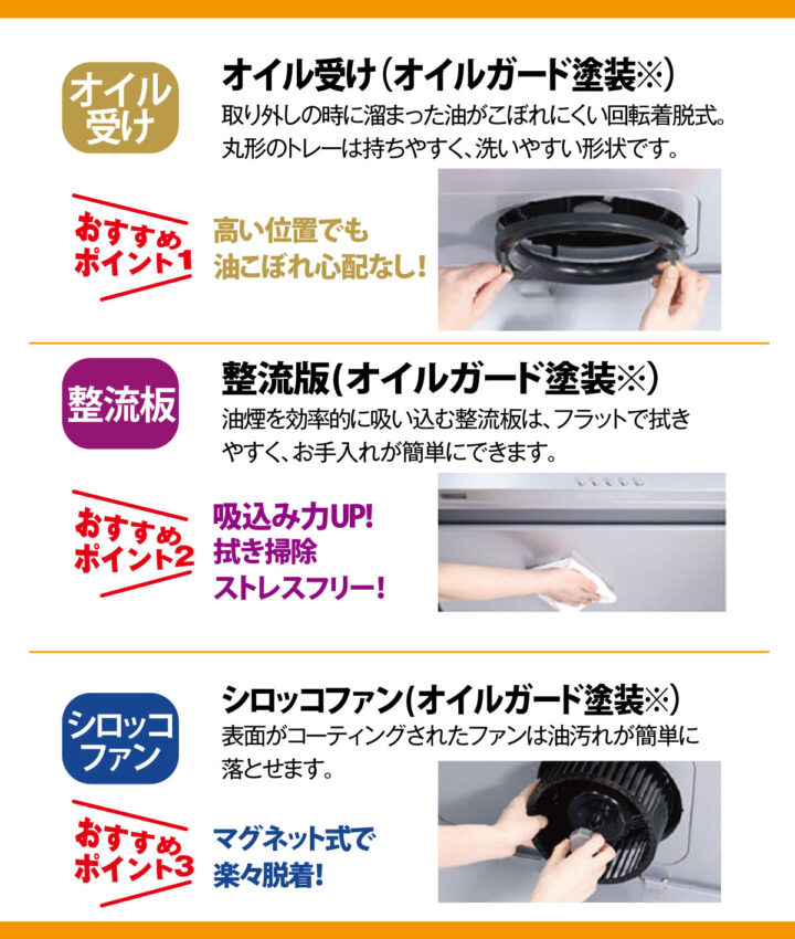- オイルガード塗装:整流板やシロッコファンには、油汚れが落ちやすい特殊な「オイルガード塗装」が施されています。