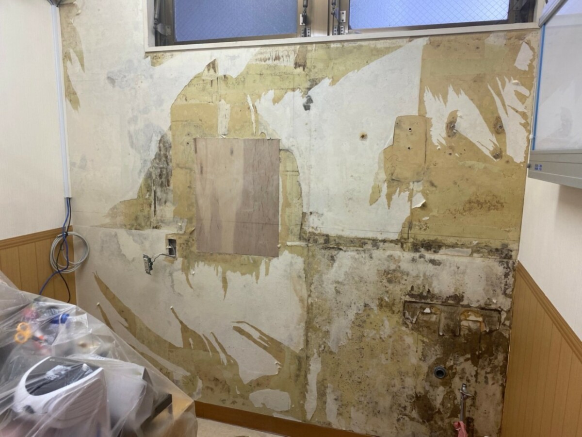 診察室の壁には湿気によるシミが発生していました。動物病院という事もあり、エコカラットをご提案させていただきました。エコカラットは調湿機能に加え、脱臭効果も期待できます。また、廊下の壁には、クロスの貼り替えだと同じ事の繰り返しになりますので、破ける事のない腰壁をご提案いたしました。