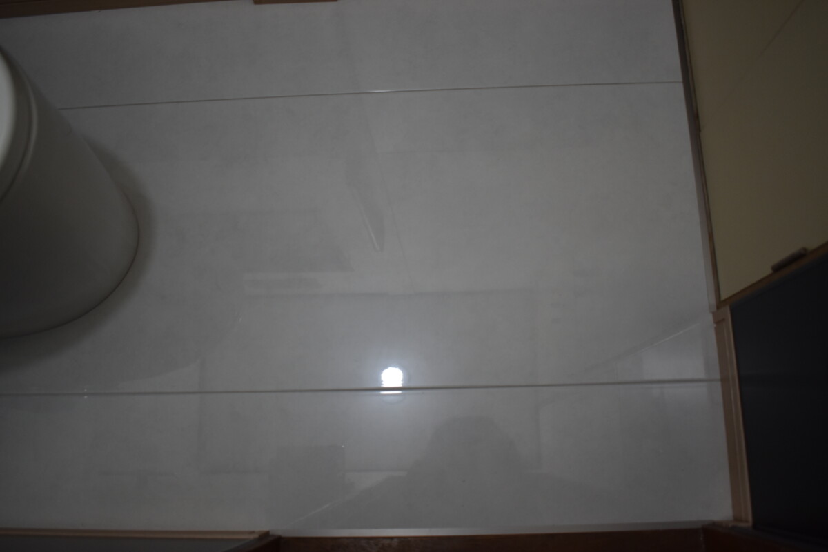 TOTOのトイレで最新の物、かつ、手入れが楽なトイレをご所望で、床はお客様の希望のハイドロセラにしました。今回、さらにトイレ空間が清掃性が高く、衛生的になるよう、腰壁部分はキッチンパネルをご提案しました。