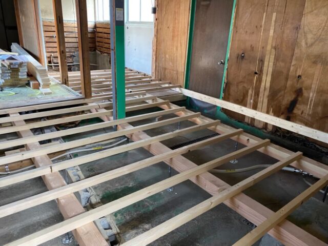 店舗入り口の間口は広いですが、店舗から作業場、作業場から居室と段差になっている建物だったので、将来車いすになったとしても無理なく生活できるように、段差を無くし、行き来しやすい間取り提案をしました。