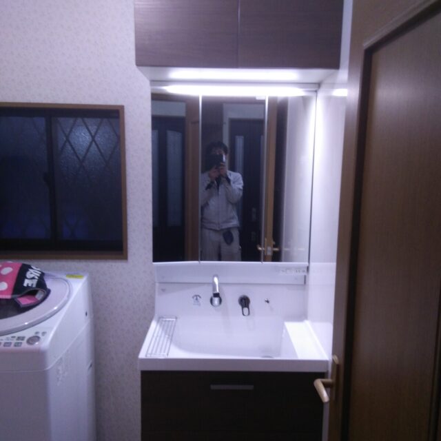 ユニットバスは清掃性バツグンのLIXILのアライズ、洗面化粧台を開き戸から整理整頓がしやすい引き出しタイプに、また鏡裏にたっぷり収納できる三面鏡をご提案いたしました。