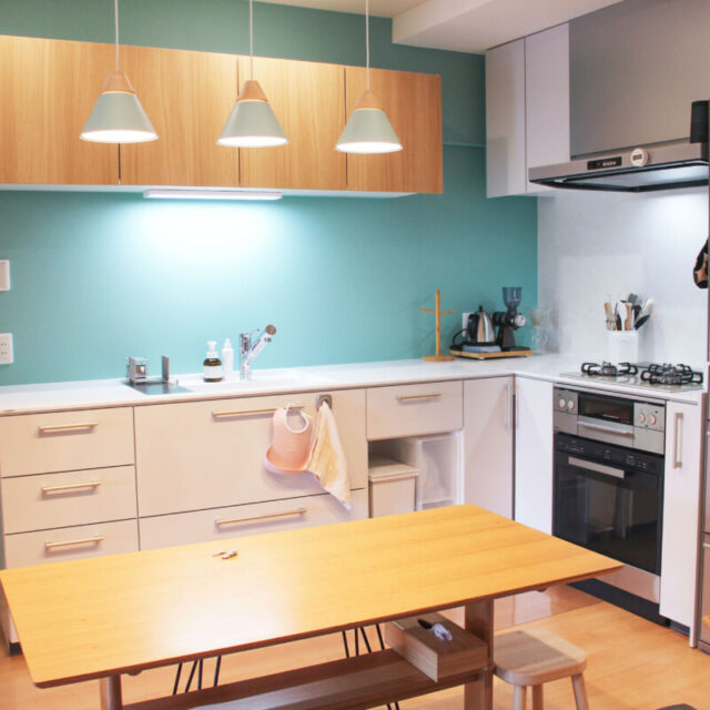 キッチン本体の形をI型からL形に変えることで、冷蔵庫置き場の位置を変更し動線問題を解消。