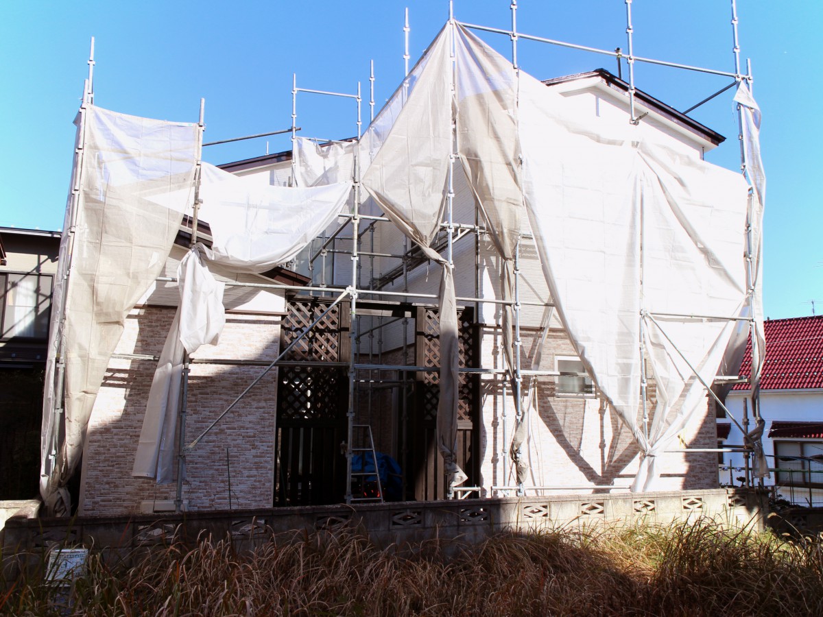 工事をする際の職人が高いところで作業する為と近隣の方に工事のゴミや汚れが付着しないようにするため建物全面に立てる必要があります。