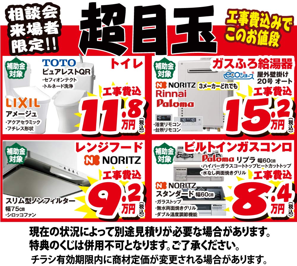 社会情勢により、相談会の開催を中止する場合や、各メーカーの生産状況が全国的に不安定となり、一部商材の納品が送れる場合がございます。