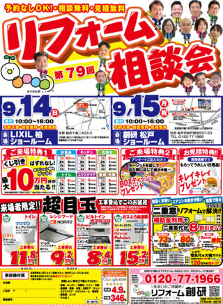 社会情勢により、相談会の開催を中止する場合や、各メーカーの生産状況が全国的に不安定となり、一部商材の納品が送れる場合がございます。