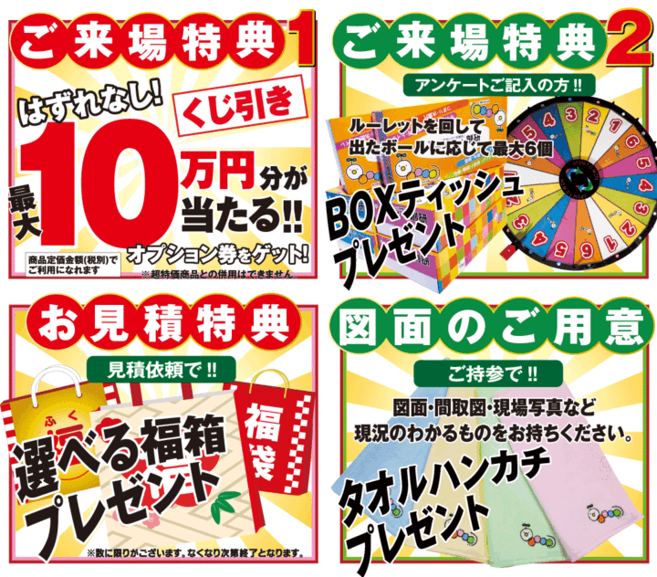 社会情勢により、相談会の開催を中止する場合や、各メーカーの生産状況が全国的に不安定となり、一部商材の納品が送れる場合がございます。