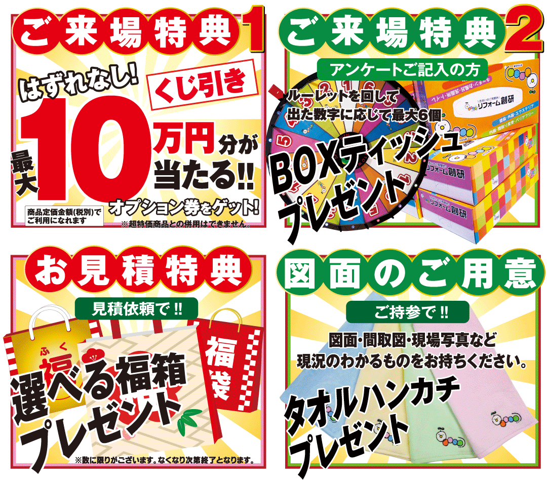 社会情勢により、相談会の開催を中止する場合や、各メーカーの生産状況が全国的に不安定となり、一部商材の納品が送れる場合がございます。
