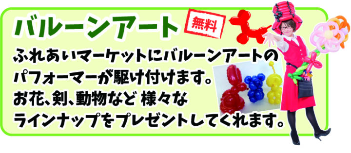 ふれあいマーケットにバルーンアートのパフォーマーが駆け付けます。