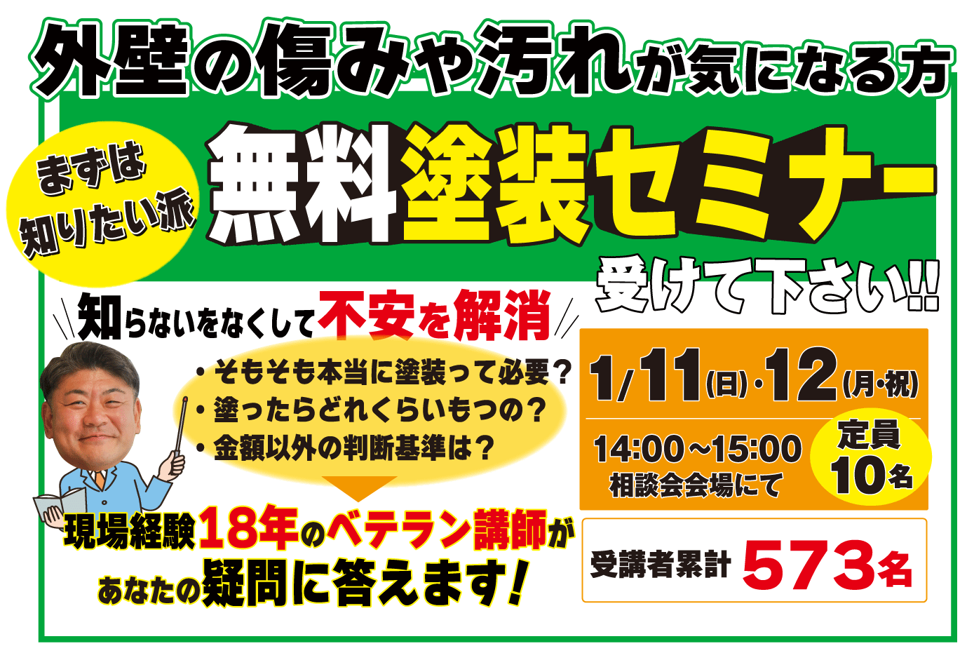 相談会と同時開催です。相談会の受付に「塗装セミナーにきた」とお伝えください。
