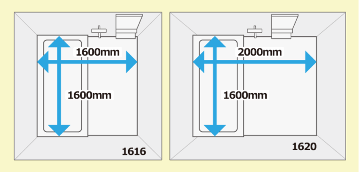 ユニットバスは1616や1620のように4桁の数字で規格が決まっています。これは、浴室内部の縦横の幅になっています。頭2桁の長さに浴槽の長辺が収まるようにできています。例えば、1620の浴室なら幅が1600mm奥行きが2000mmとなり、浴槽のサイズは1616と同じになります。