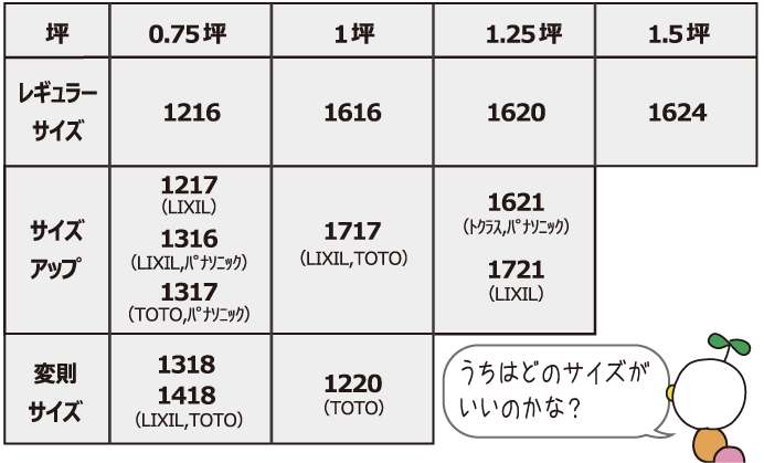 これは、0.75坪(1216)の場合だと、0.75坪のスペースに収めるのにちょうどいいサイズが1216となります。