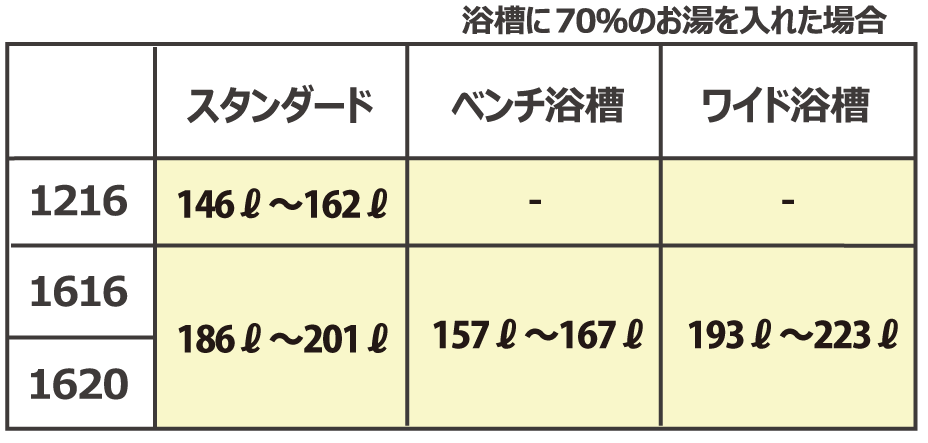 各メーカーで違いはありますが、浴槽に70%程度お湯を張った場合の湯量となります。ベンチ浴槽の場合、従来の浴槽に比べ満水容量を35L削減します。