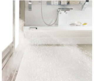 床に向かって一気に噴出するお湯のシャワーが、1分で床面の温度を25℃まで上昇させて浴室を足元からあたためます。