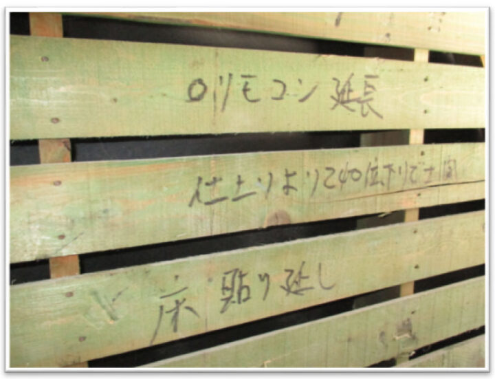 お風呂メーカーが壁等に給排水管の位置を書き込みます。メーカーと職人が打合せをする重要な工程となります。