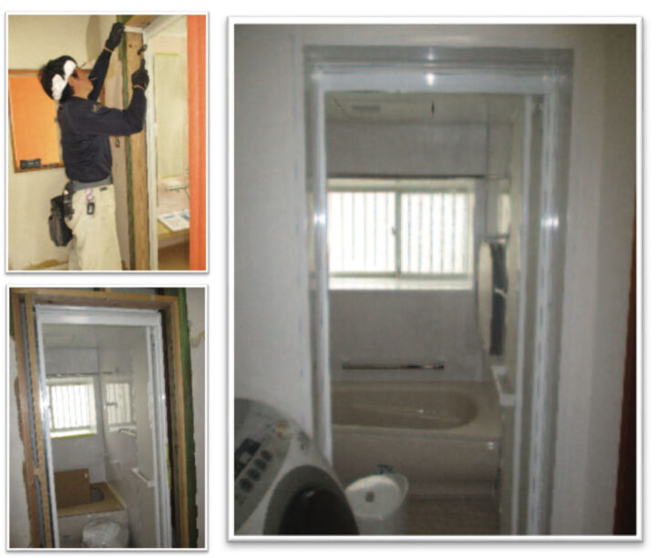 ドアを取付けた後、壁をボードで補修し、ドア枠を寸法通りにカットし組んでいきます。