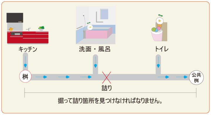 分岐部に桝を設けることにより、万が一詰りが発生しても詰まっている箇所を特定しやすく、その際の工事も最小限で済みます。