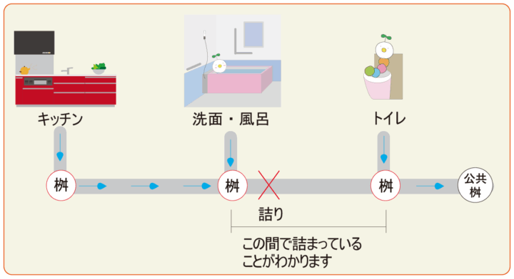 トイレからは排水しているが、洗面・風呂から水が流れない。トイレと洗面・風呂の間で詰まっていることが分かります。