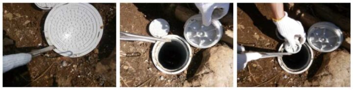 ①マイナスドライバーを使い、汚水桝のフタを開けます。