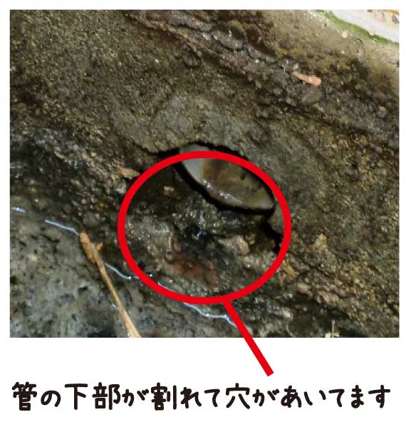 コンクリート桝の管下部分が割れている場合は汚水が管下に流れてしまいますのでモルタル補修しましょう。