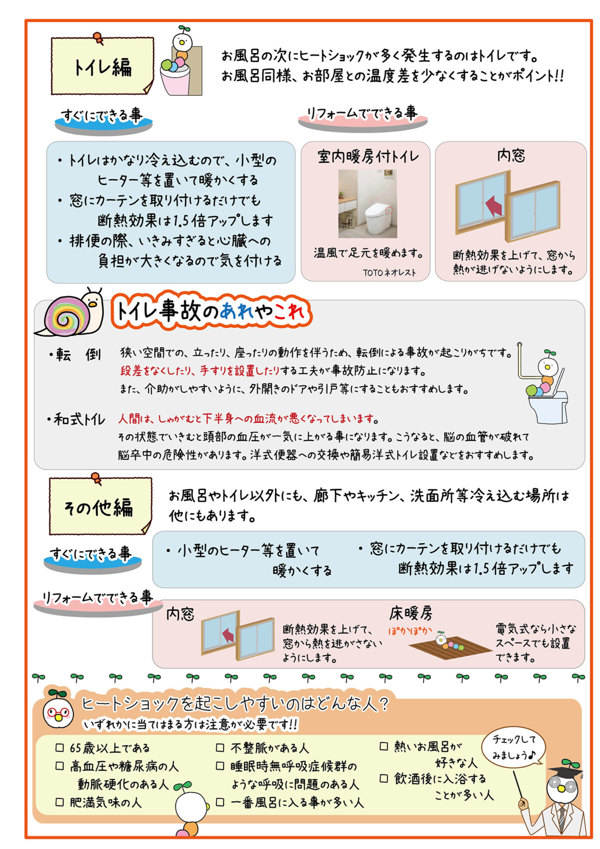 一般的な日本の住宅は浴室やトイレ等の水廻りを北側に設置するのが基本です。そのため冬になると日当たりが悪く冷え込み、他の部屋との温度差が大きくなります。特に入浴時における脱衣室や洗い場の寒さ、さらに熱いお湯が原因で脳内出血や心筋梗塞を引き起こしてしまうのです。