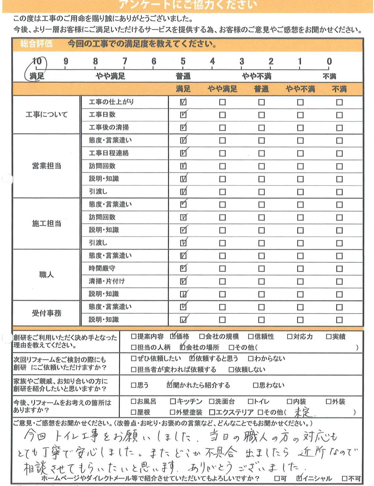 今回トイレ工事をお願いしました。当日の職人の方の対応もとても丁寧で安心しました。