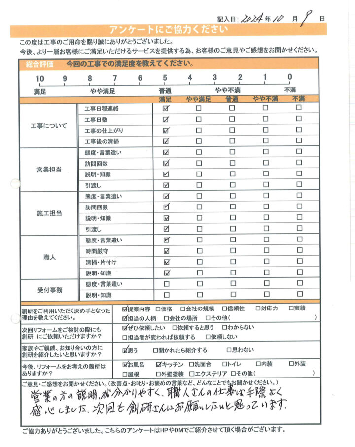 営業の方の説明が分かりやすく、職人さんの仕事は手際よく感心しました。次回も創研さんにお願いしたいと思っています。