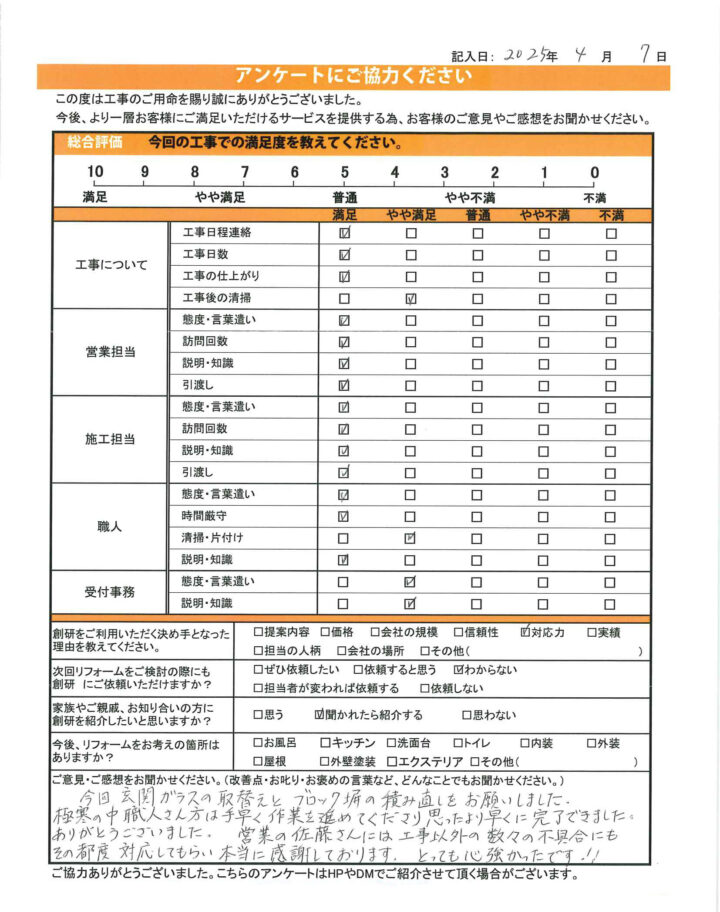 今回玄関ガラスの取替えとブロック塀の積み直しをお願いしました。