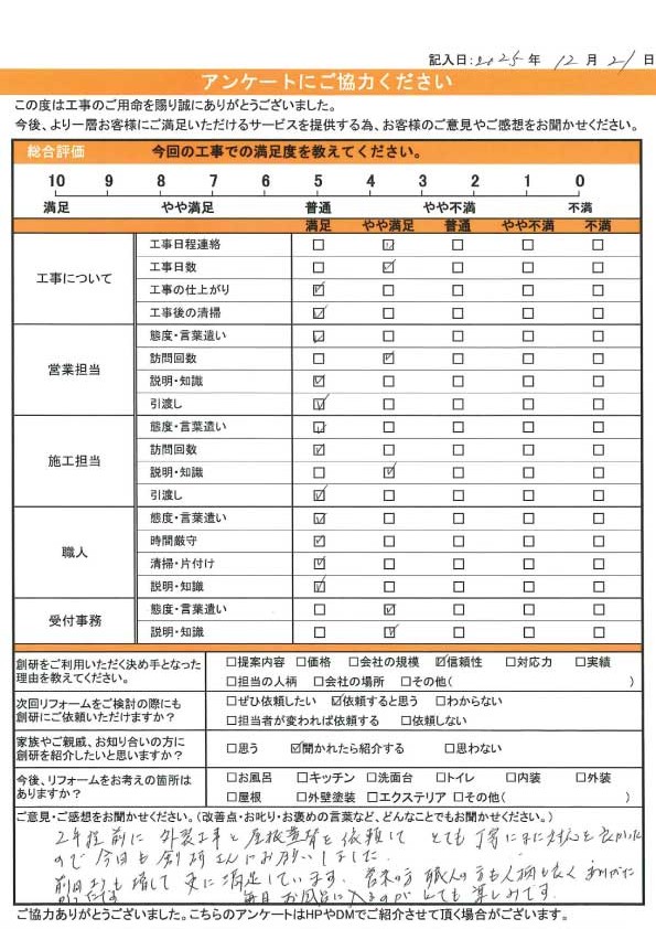 2年程前に外装工事と屋根葺替を依頼して、とても丁寧にまた対応も良かったので今日も創研さんにお願いしました。